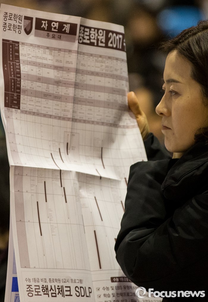 (서울=포커스뉴스) 12일 오후 서울 성동구 한양대학교 올림픽체육관에서 열린 '2017학년도 대학입시설명회'에 참석한 한 학부형이 주요 대학 배치참고표를 보고 있다.