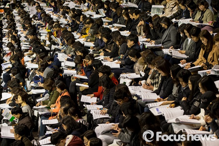 (서울=포커스뉴스) 12일 오후 서울 성동구 한양대학교 올림픽체육관에서 열린 '2017학년도 대학입시설명회'에 참석한 학부형, 수험생 및 관계자들이 주요 대학 배치참고표를 보고 있다.