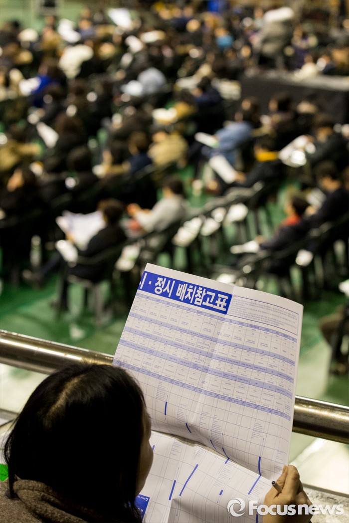 (서울=포커스뉴스) 12일 오후 서울 성동구 한양대학교 올림픽체육관에서 열린 '2017학년도 대학입시설명회'에 참석한 학부형, 수험생 및 관계자들이 주요 대학 배치참고표를 보고 있다.