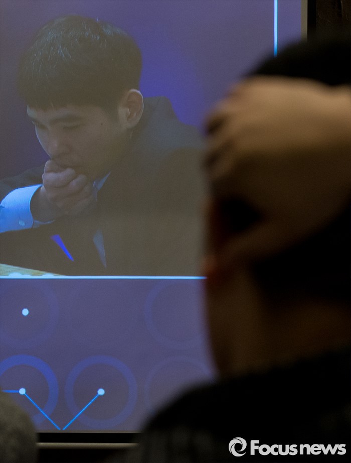 (서울=포커스뉴스) 이세돌 9단과 인공지능 알파고의 '구글 딥마인드 챌린지 매치' 3차 대국이 열린 12일 오후 서울 종로구 포시즌스 호텔 내 공개해설장에서 취재진이 대국을 지켜보고 있다.