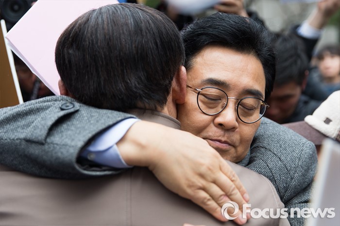 (서울=포커스뉴스) 20대 총선 공천 배제된 전병헌 더불어민주당 의원이 13일 오전 공직선거후보자추천재심위원회에 재심신청서를 제출하기 위해 서울 여의도 당사 방문 전 지지자들과 포옹하고 있다.