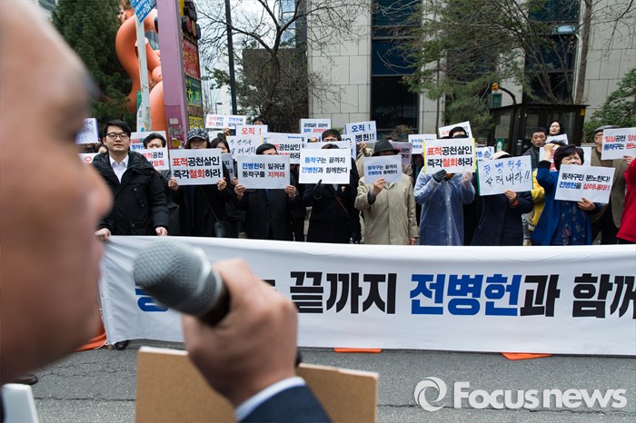 (서울=포커스뉴스) 13일 오전 서울 여의도 더민주 당사 앞에서 전병헌 더불어민주당 의원 지지자들이 정 의원의 컷오프 철회를 요구하는 손팻말을 들고 있다.