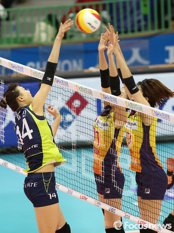 IBK기업은행과 현대건설의 챔피언결정전 1차전은 17일 화성실내체육관에서 열린다.(수원=포커스뉴스) 5일 수원실내체육관에서 열린 프로배구 '2015~2016 NH농협 V-리그’여자부 2라운드 현대건설-흥국생명 경기에서 현대건설 양효진의의 연타 공격에 흥국생명 이재영, 김수지가 블로킹으로 막고 있다. 2015.11.05 우정식 기자