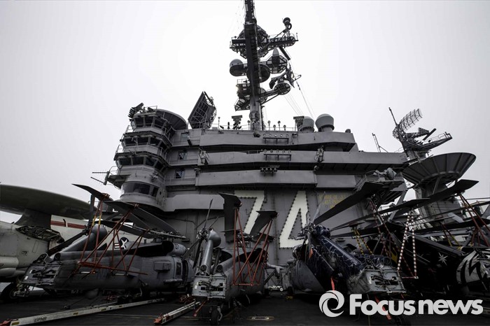 (부산=포컨스뉴스) 13일 오후 부산 남구에 위치한 해군작전사령부에 입항한 존 C. 스테니스 핵항모가 취재진에게 공개되었다. 키리졸브 독수리 훈련에 참가하기 위해 한국을 찾은 스테니스항모는 길이 333m, 폭 78m,탑승 승조원은 6500명에 달하는 미 해군 핵심항모 중 하나다. 스테니스호 함교 앞에 대잠헬기인 씨호크들이 주기되어 있다.