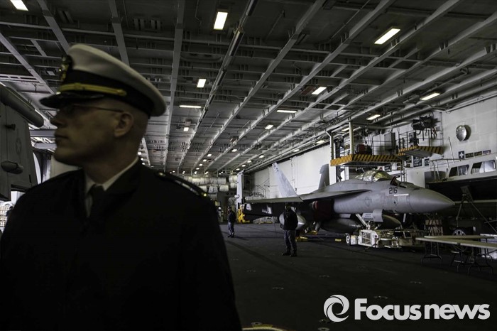 (부산=포커스뉴스) 13일 오후 부산 남구에 위치한 해군작전사령부에 입항한 존 C. 스테니스 핵항모가 취재진에게 공개되었다. 키리졸브 독수리 훈련에 참가하기 위해 한국을 찾은 스테니스항모는 길이 333m, 폭 78m,탑승 승조원은 6500명에 달하는 미 해군 핵심항모 중 하나다. 정비 등을 위한 비행 격납고 모습.