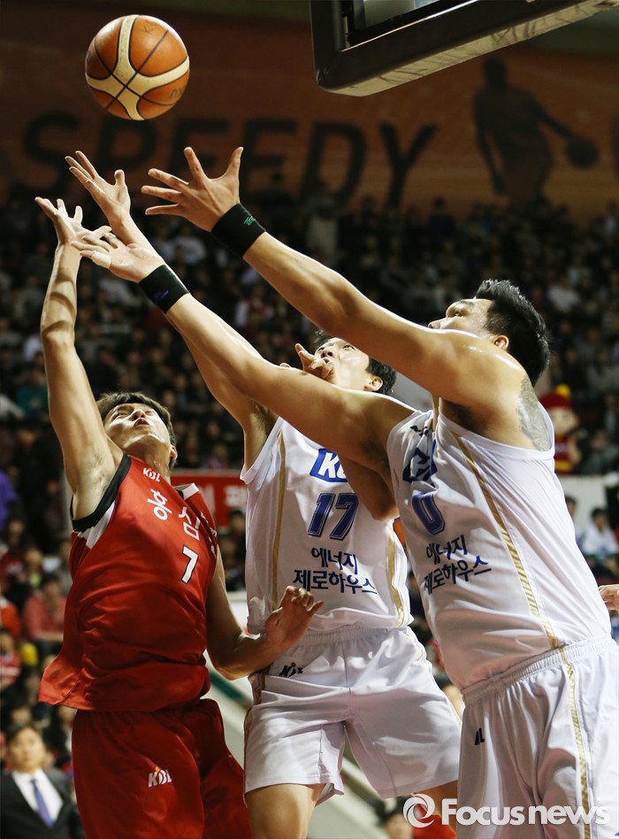 (안양=포커스뉴스) 13일 안양실내체육관에서 열린 2015-2016 프로농구 KGC-KCC 4강플레이오프 4차전에서 KCC 하승진, 신명호와 KGC 박찬희가 리바운드볼을 잡기 위해 손을 뻗고 있다.