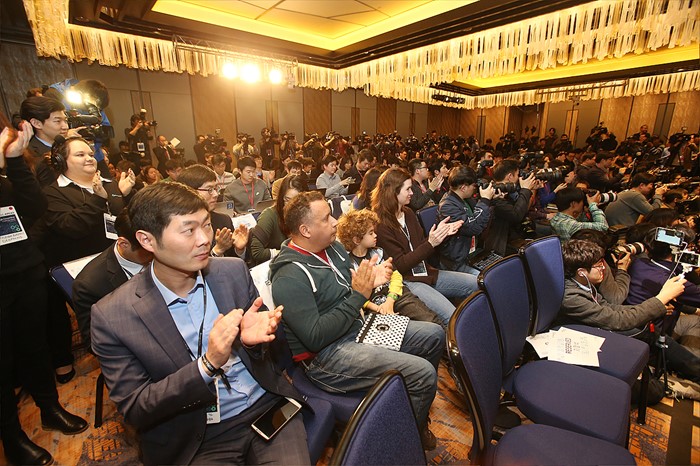 (서울=포커스뉴스) 13일 오후 서울 종로구 포시즌스호텔에서 열린 구글 딥마인드 챌린지 매치에서 이세돌 9단이 인공지능 바둑프로그램 알파고를 누르고 첫 승리를 거두자 중계를 지켜보던 기자와 관객들이 박수를 치고 있다. <사진제공=구글>