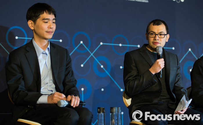 (서울=포커스뉴스) 13일 오후 서울 종로구 포시즌스호텔에서 열린 구글 딥마인드 챌린지 매치 제4국 기자회견에 참석한 데미스 하사비스(오른쪽) 구글 딥마인드 최고경영자가 취재진의 질문에 답하고 있다. 왼쪽은 이세돌 9단.