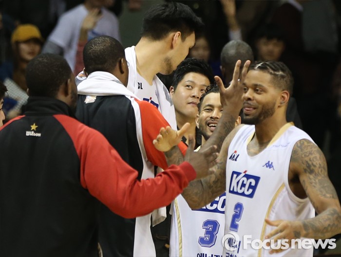 (안양=포커스뉴스) 13일 안양실내체육관에서 열린 2015-2016 프로농구 KGC-KCC 4강 플레이오프에서 KGC를 3승1패로 물리치고 챔피언결정전에 진출한 KCC 선수들이 기뻐하고 있다.