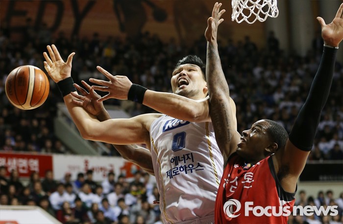 (안양=포커스뉴스) 13일 안양실내체육관에서 열린 2015-2016 프로농구 KGC-KCC 4강플레이오프 4차전에서 KCC 하승진의 슈팅을 KGC 마리오 리틀이 뒤에서 저지하고 있다.