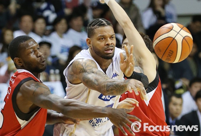 (안양=포커스뉴스) 13일 안양실내체육관에서 열린 2015-2016 프로농구 KGC-KCC 4강플레이오프 4차전에서 KCC 안드레 에밋이 KGC 마리오 리틀과 김기윤의 더블팀에 막히자 패스를 시도하고 있다.