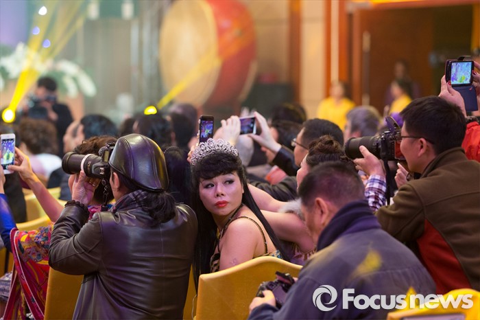 (동관/중국=포커스뉴스)중국 광동성 동관에서 12일 오후 열린 제27회 미시즈월드 미인대회에서 왕관을 쓴 관람객 사이로 다른 관람객들은 사진을 찍고 있다.