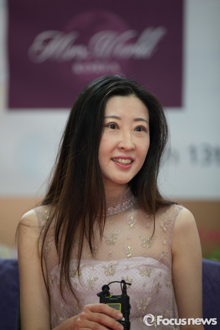 (동관/중국=포커스뉴스) 13일 오전 중국 광동성 동관 굿뷰호텔에서 열린 제28회 미시즈월드 한국 개최 기자간담회에 송지연 미시즈월드 한국조직위원회 위원장이 취재진의 질문에 대답하고 있다.