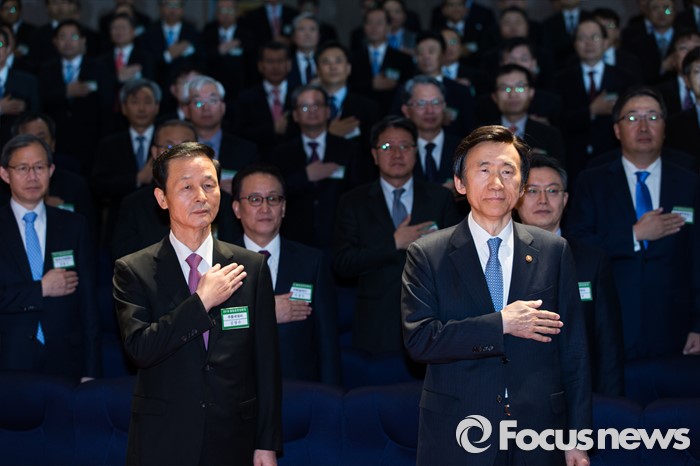 (서울=포커스뉴스) 14일 오전 서울 종로구 외교부에서 2016년도 재외공관장회의에 참석한 윤병세(앞줄 오른쪽) 외교부 장관이 김장수 주중국대사를 비롯한 재외공관장들과 국민의례를 하고 있다.