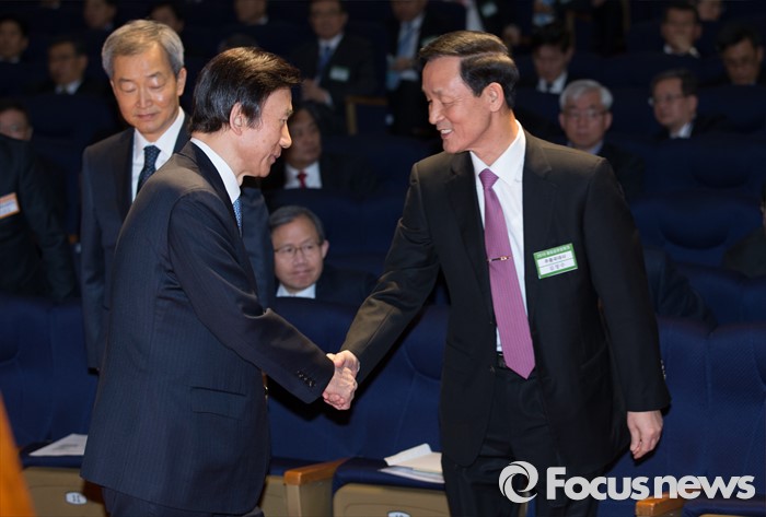 (서울=포커스뉴스) 14일 오전 서울 종로구 외교부에서 2016년도 재외공관장회의에 참석한 윤병세(왼쪽) 외교부 장관이 김장수 주중국대사와 인사를 나누고 있다.