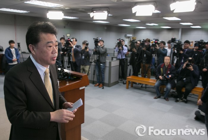 (서울=포커스뉴스) 김성수 더불어민주당 대변인이 14일 오전 서울 여의도 국회 정론관에서 추가 공천심사 결과 발표를 마친 뒤 퇴장하고 있다. 이날 더불어민주당은 이미경, 이해찬, 정호준 의원의 공천 배제(컷오프)를 발표했다.