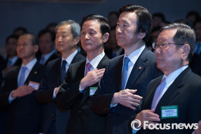 (서울=포커스뉴스) 14일 오전 서울 종로구 외교부 청사에서 열린 '2016년도 재외공관장회의'에 참석한 윤병세(오른쪽 두 번째 외교부 장관과 김장수(오른쪽 세 번째) 주중대사 등이 국민의례를 하고 있다.