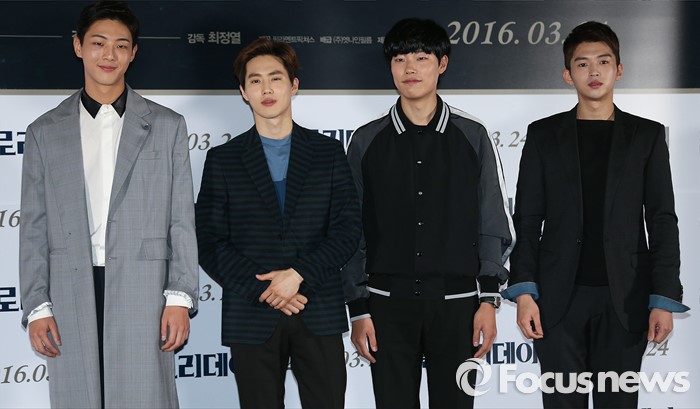 (서울=포커스뉴스) 14일 오후 서울 성동구 왕십리 CGV에서 열린 영화 '글로리데이' 언론시사회에 참석한 배우 지수(왼쪽부터), 김준면, 류준열, 김희찬이 포토타임을 갖고 있다.