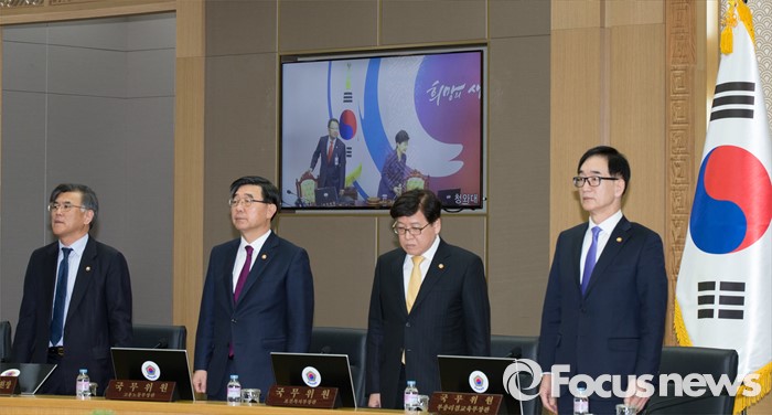 (세종=포커스뉴스) 15일 오전 세종시 정부세종청사 국무회의장에서 열린 청와대-세종청사 국무회의에서 국무위원들이 박근혜 대통령 입장에 일어서 기다리고 있다.