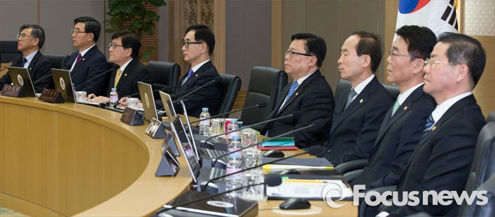 (세종=포커스뉴스) 15일 오전 세종시 정부세종청사 국무회의장에서 열린 청와대-세종청사 국무회의에서 국무위원들이 영상을 통해 박근혜 대통령의 모두발언을 경청하고 있다.