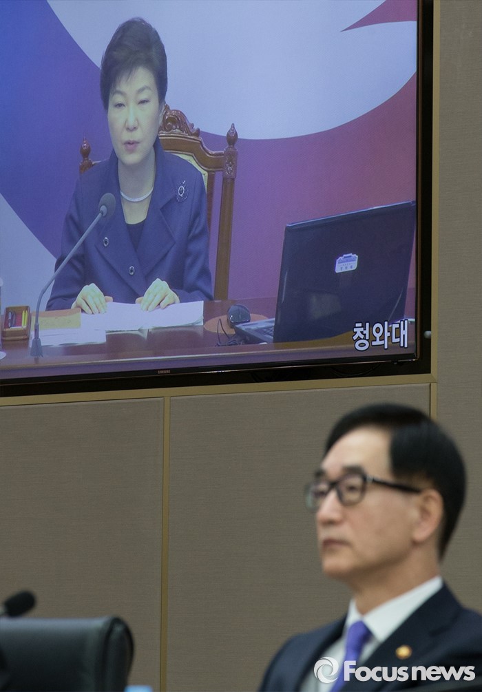 (세종=포커스뉴스) 15일 오전 세종시 정부세종청사 국무회의장에서 열린 청와대-세종청사 국무회의에서 국무위원들이 영상을 통해 박근혜 대통령의 모두발언을 경청하고 있다.
