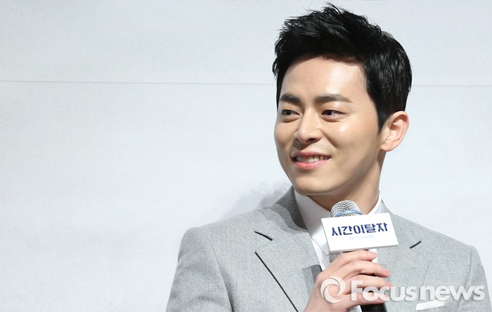 (서울=포커스뉴스) 15일 오전 서울 강남구 압구정 CGV에서 열린 영화 '시간이탈자' 제작보고회에 참석한 배우 조정석이 진행자에게 질문을 받고 있다.