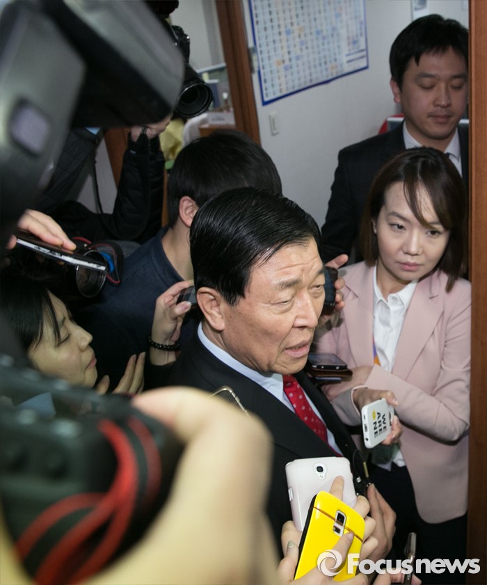 (서울=포커스뉴스) 황진하 새누리당 사무총장이 15일 오전 서울 여의도 당사에서 이한구 공천관리위원장과 비공개 논의를 위해 이동하며 취재진 질문에 답하고 있다.