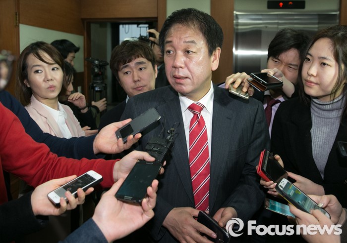 (서울=포커스뉴스) 박종희 새누리당 제2사무부총장이 15일 오전 서울 여의도 당사에서 이한구 공천관리위원장과 비공개 논의를 위해 이동하며 취재진 질문에 답하고 있다.