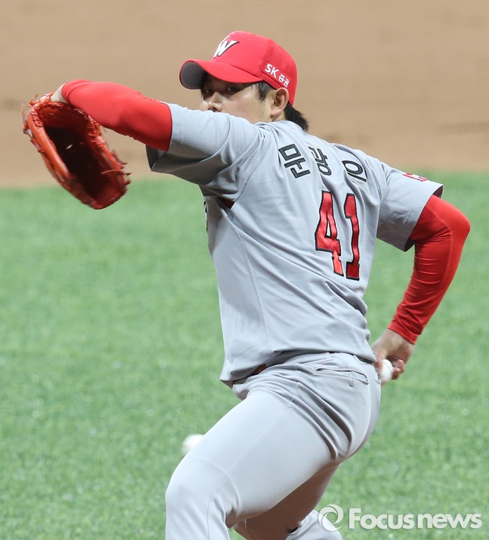 (서울=포커스뉴스) 15일 서울 고척스카이돔에서 열린 2016 프로야구 시범경기 SK-넥센 경기에서 SK 선발투수 문광은이 힘차게 투구하고 있다.