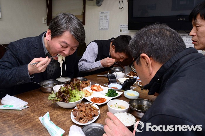 (서울=포커스뉴스) 안철수 국민의당 상임공동대표가 15일 오후 서울 마포구 연남동 한 식당에서 택시기사들과 식사를 하고 있다.