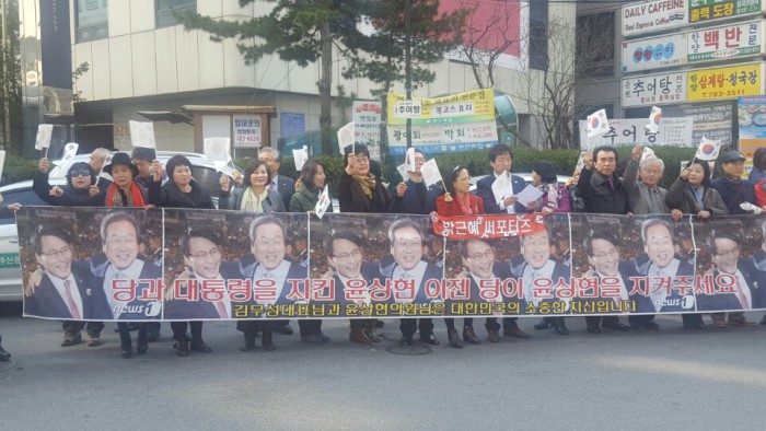 (서울=포커스뉴스) 15일 오후 새누리당 윤상현 의원 지지자들이 여의도 새누리당 당사 앞에서 시위를 벌였다.