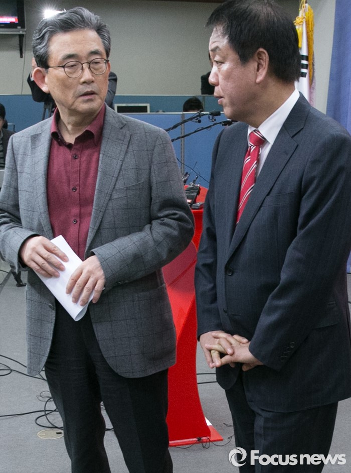 (서울=포커스뉴스) 이한구(왼쪽) 새누리당 공천관리위원장과 박종희 제2사무부총장이 15일 오후 서울 여의도 당사에서 20대 총선 3차 경선결과를 발표를 마친 뒤 대화하고 있다. 이날 새누리당 공천관리위원회는 서울 종로구 선거구에 오세훈 전 서울시장이 경선 후보로 확정됐다고 전했다.