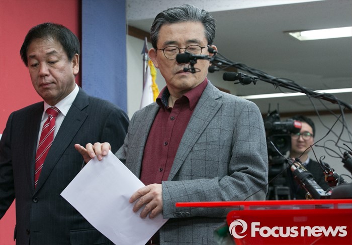 (서울=포커스뉴스) 이한구(오른쪽) 새누리당 공천관리위원장과 박종희 제2사무부총장이 15일 오후 서울 여의도 당사에서 20대 총선 3차 경선결과를 발표를 위해 입장하고 있다. 이날 새누리당 공천관리위원회는 서울 종로구 선거구에 오세훈 전 서울시장이 경선 후보로 확정됐다고 전했다.