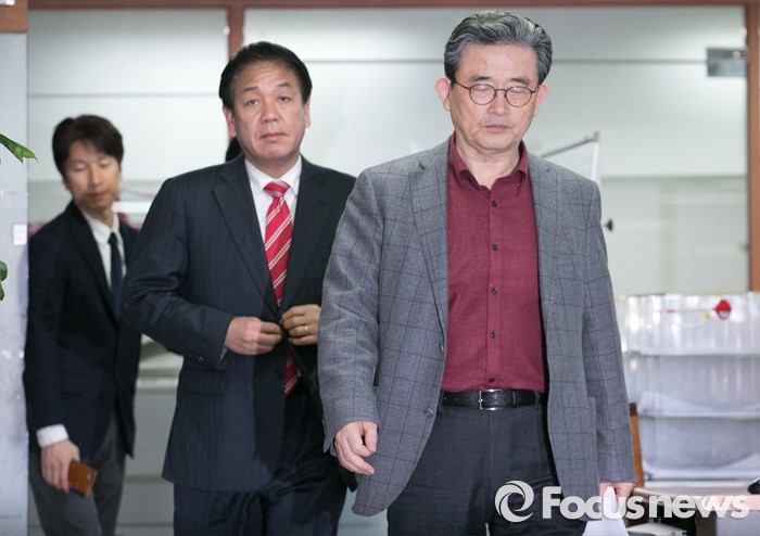 (서울=포커스뉴스) 이한구(오른쪽) 새누리당 공천관리위원장과 박종희 제2사무부총장이 15일 오후 서울 여의도 당사에서 20대 총선 3차 경선결과를 발표를 위해 입장하고 있다. 이날 새누리당 공천관리위원회는 서울 종로구 선거구에 오세훈 전 서울시장이 경선 후보로 확정됐다고 전했다.