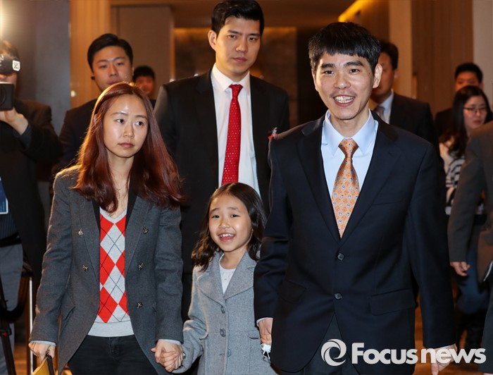 (서울=포커스뉴스) 15일 오후 서울 광화문 포시즌스 호텔에서 열린 구글 딥마인드 챌린지 매치 시상식을 마친 바둑기사 이세돌 9단(맨 오른쪽)이 아내 김현진 씨, 딸 혜림 양과 함께 발걸음을 옮기고 있다.