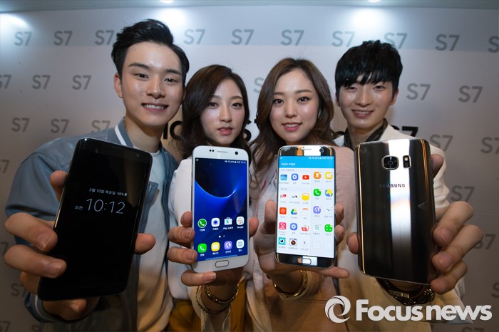 ‘갤럭시 S7 엣지’와 ‘갤럭시 S7’은 지난 11일부터 국내 이동통신 3사를 통해 판매가 시작됐다.출고가는 갤럭시 S7 32GB 83만 6000원, 64GB 88만원, 갤럭시 S7 엣지 32GB 92만 4000원, 64GB 96만 8000원 이다. 색상은 ‘갤럭시 S7 엣지’와 ‘갤럭시 S7’ 32GB의 경우 블랙 오닉스, 화이트 펄, 실버 티타늄 3가지로 출시된다. 단 64GB모델은 골드 플래티넘 단일 색상으로 출시된다.지난 10일 오전 서울 중구 신라호텔에서 삼성전자의 스마트폰 '갤럭시 S7 엣지와 갤럭시 S7'을 모델들이 선보이고 있다. 이번 제품은 듀얼 픽셀과 F1.7 조리개 탑재, 방수·방진과 대용량 배터리가 탑재되어 있다. 2016.03.10 허란 기자