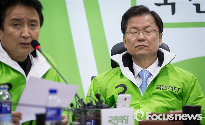 (서울=포커스뉴스) 천정배 국민의당 상임공동대표(오른쪽)가 참석한 가운데 김영환 공동선대위원장이16일 오전 서울 여의도 의원회관에서 열린 최고위원회의에서 모두발언을 하고 있다.