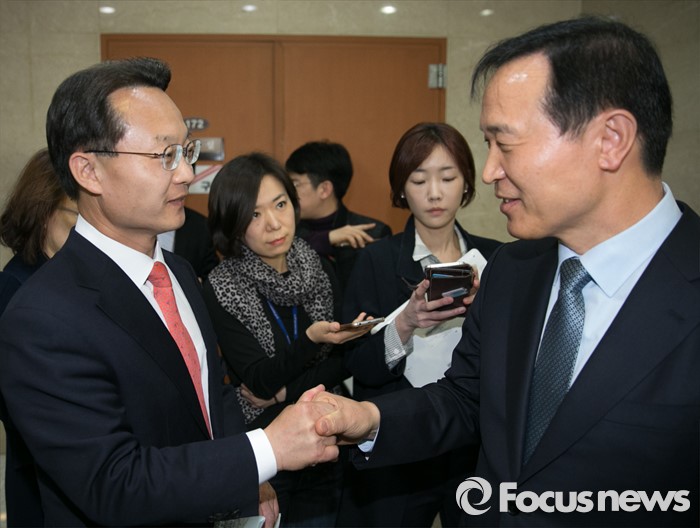 (서울=포커스뉴스) 공천 배제(컷오프)된 조해진(왼쪽) 새누리당 의원이 16일 오전 서울 여의도 국회 정론관 앞에서 공천관리위원회 결정에 반발하는 내용의 기자회견을 마친 뒤 후보 공천에서 탈락해 기자회견을 앞둔 임태희 전 의원과 만나 대화하고 있다.