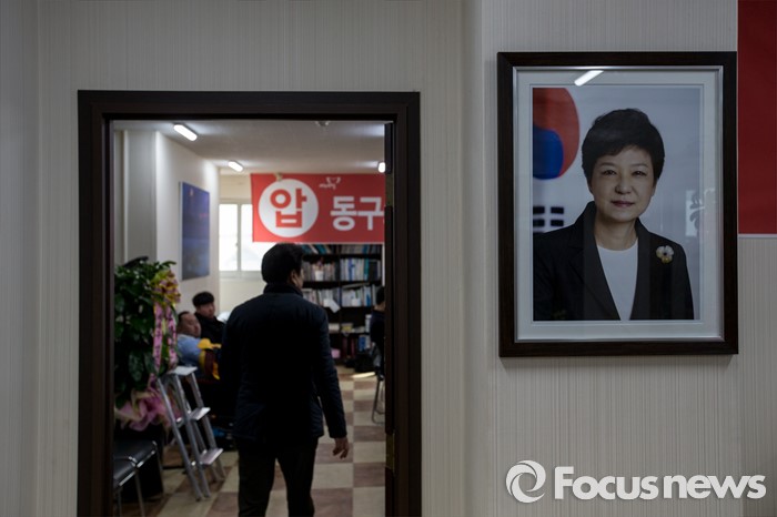 (대구=포커스뉴스) 새누리당이 유승민(대구 동구을) 의원에 대한 공천 배제안을 놓고 고민하고 있는 16일 오전 대구 동구 유 의원 선거사무소에 박근혜 대통령 사진이 걸려 있다.