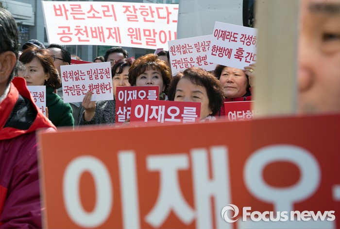 (서울=포커스뉴스) 16일 오전 서울 여의도 새누리당사 앞에서 공천 배제(컷오프)된 이재오 의원의 지지자들이 공천관리위원회의 결정 철회를 촉구하는 집회를 하고 있다.
