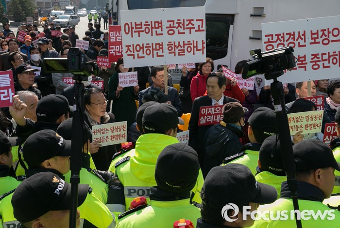 (서울=포커스뉴스) 16일 오전 서울 여의도 새누리당사 앞에서 공천 배제(컷오프)된 이재오 의원의 지지자들이 공천관리위원회의 결정 철회를 촉구하는 집회를 하고 있다.