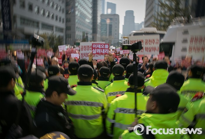 (서울=포커스뉴스) 16일 오전 서울 여의도 새누리당사 앞에서 공천 배제(컷오프)된 이재오 의원의 지지자들이 공천관리위원회의 결정 철회를 촉구하는 집회를 하고 있다.
