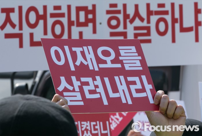 (서울=포커스뉴스) 16일 오전 서울 여의도 새누리당사 앞에서 공천 배제(컷오프)된 이재오 의원의 지지자들이 공천관리위원회의 결정 철회를 촉구하는 집회를 하고 있다.