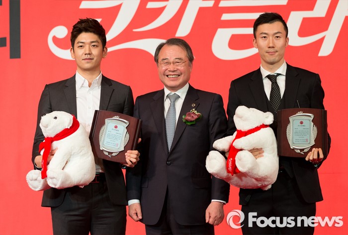 (서울=포커스뉴스) 16일 오전 서울 중구 더플라자호텔 그랜드볼룸에서 제21회 코카콜라 체육대상 시상식에 참석한 이용대(왼쪽)와 유연성(오른쪽)이 우수단체상을 수상하고 있다. 가운데는 강영중 국민생활체육회장.