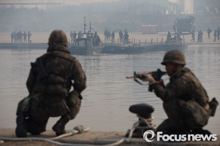 (이천=포커스뉴스) 16일 오전 경기도 이천시 7공병여단 도하훈련장에서 열린 '한·미 연합 소부대 도하훈련'에서 한국군 제7공병여단 도하대대 장병들이 부교를 설치를 위해 경계 근무를 서고 있다.