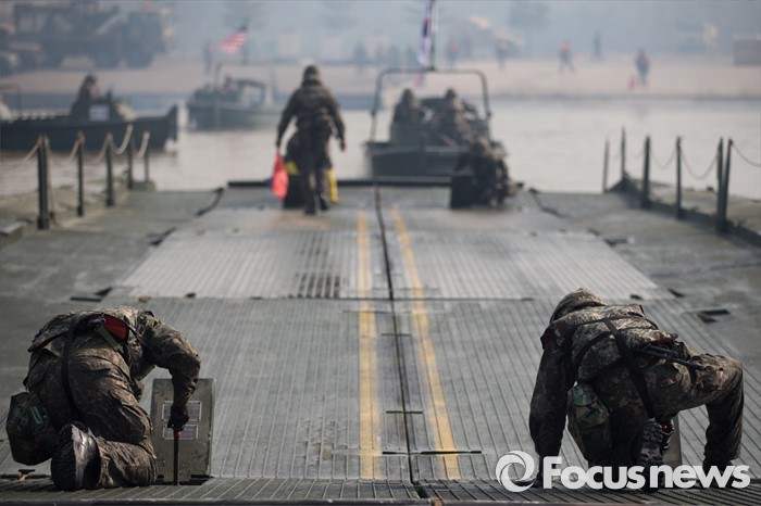 (이천=포커스뉴스) 16일 오전 경기도 이천시 7공병여단 도하훈련장에서 열린 '한·미 연합 소부대 도하훈련'에서 한국군 제7공병여단 도하대대 장병들이 부교를 설치하고 있다.
