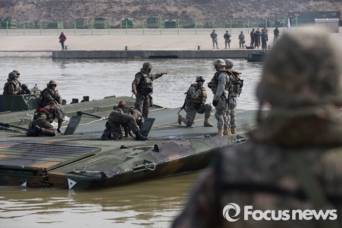 (이천=포커스뉴스) 16일 오전 경기도 이천시 7공병여단 도하훈련장에서 열린 '한·미 연합 소부대 도하훈련'에서 한국군 제7공병여단 도하대대와 미군 제2전투항공여단 공병대대 장병들이 부교를 설치하고 있다.