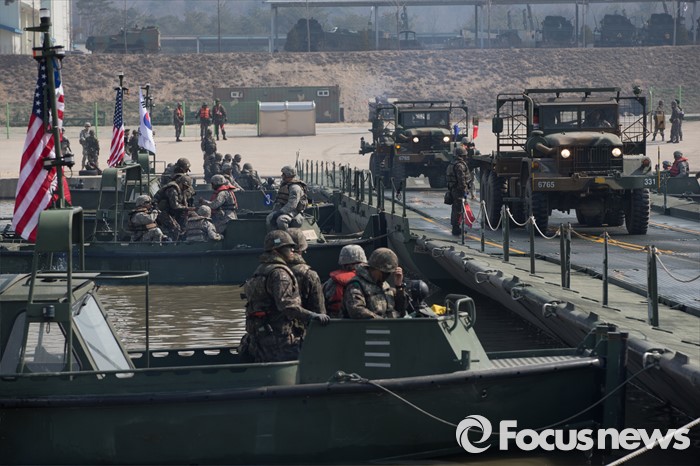 (이천=포커스뉴스) 16일 오전 경기도 이천시 7공병여단 도하훈련장에서 열린 한국군 제7공병여단 도하대대와 미군 제2전투항공여단 공병대대의 '한·미 연합 소부대 도하훈련'에서 전차와 장갑차들이 부교를 도하하고 있다.