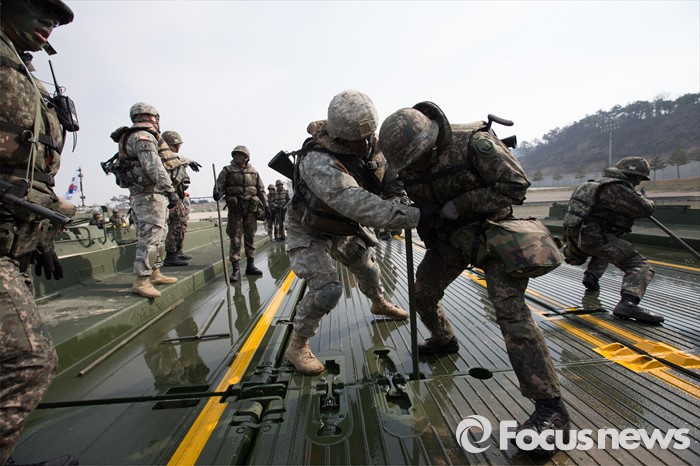 (이천=포커스뉴스) 16일 오전 경기도 이천시 7공병여단 도하훈련장에서 열린 '한·미 연합 소부대 도하훈련'에서 한국군 제7공병여단 도하대대와 미군 제2전투항공여단 공병대대 장병들이 부교를 설치하고 있다.