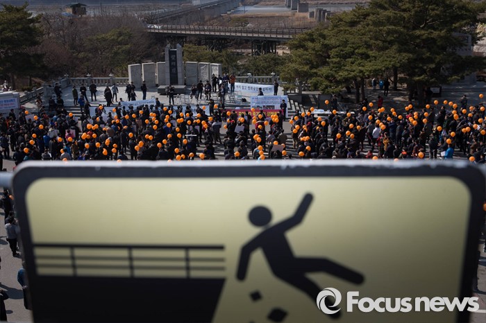 (파주=포커스뉴스) 16일 오후 경기도 파주시 임진각 망배단에서 개성공단 입주기업, 영업기업, 협력기업 등 대표를 비롯한 임직원과 가족들이 '개성공단 평화대행진 집회'를 하고 있다.
